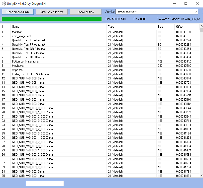 - UnityEX 프로그램을 실행한 후, 좌상단의 Open archive Unity로 resources.assets를 불러옵니다.
