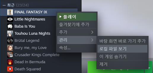 - 스팀에서 게임 - 우클릭 - 관리 - 로컬 파일 보기 를 선택해 게임 폴더로 진입합니다.