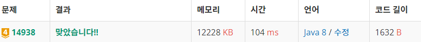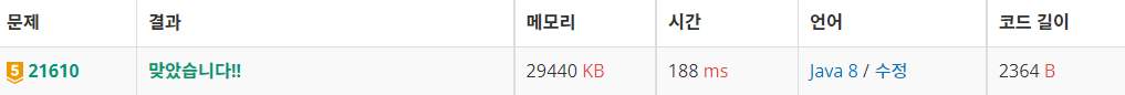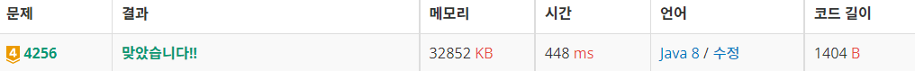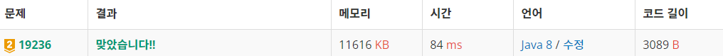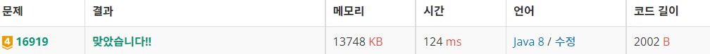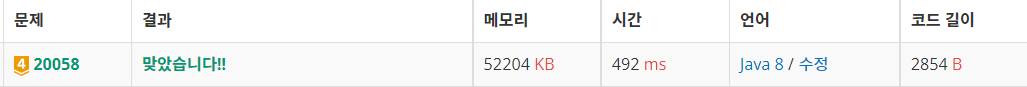 [문제링크] 19236번: 청소년 상어 첫째 줄부터 4개의 줄에 각 칸의 들어있는 물고기의 정보가 1번 행부터 순서대로 주어진다. 물고기의 정보는 두 정수 ai, bi로 이루어져 있고, ai는 물고기의 번호, bi는 방향을 의미한다. 방향 bi는 www.acmicpc.net 0. 백트래킹 / 구현 문제 1. 백트래킹을 위하여, 상어의 각 이동 단계마다 map과 물고기 방향 정보를 저장한다 2. 해당 상황에서 물고기 이동 - 가능한 모든 상어 이동에 대해 재귀를 돌린 다음, 저장해둔 정보를 복원하고 이전 단계로 돌아간다 3. 각 재귀 단계에서 먹은 물고기 번호의 합을 저장, 더이상 진행 불가능할때 전역변수인 maxEat과 비교, 갱신한다 import java.io.BufferedReader; import ..